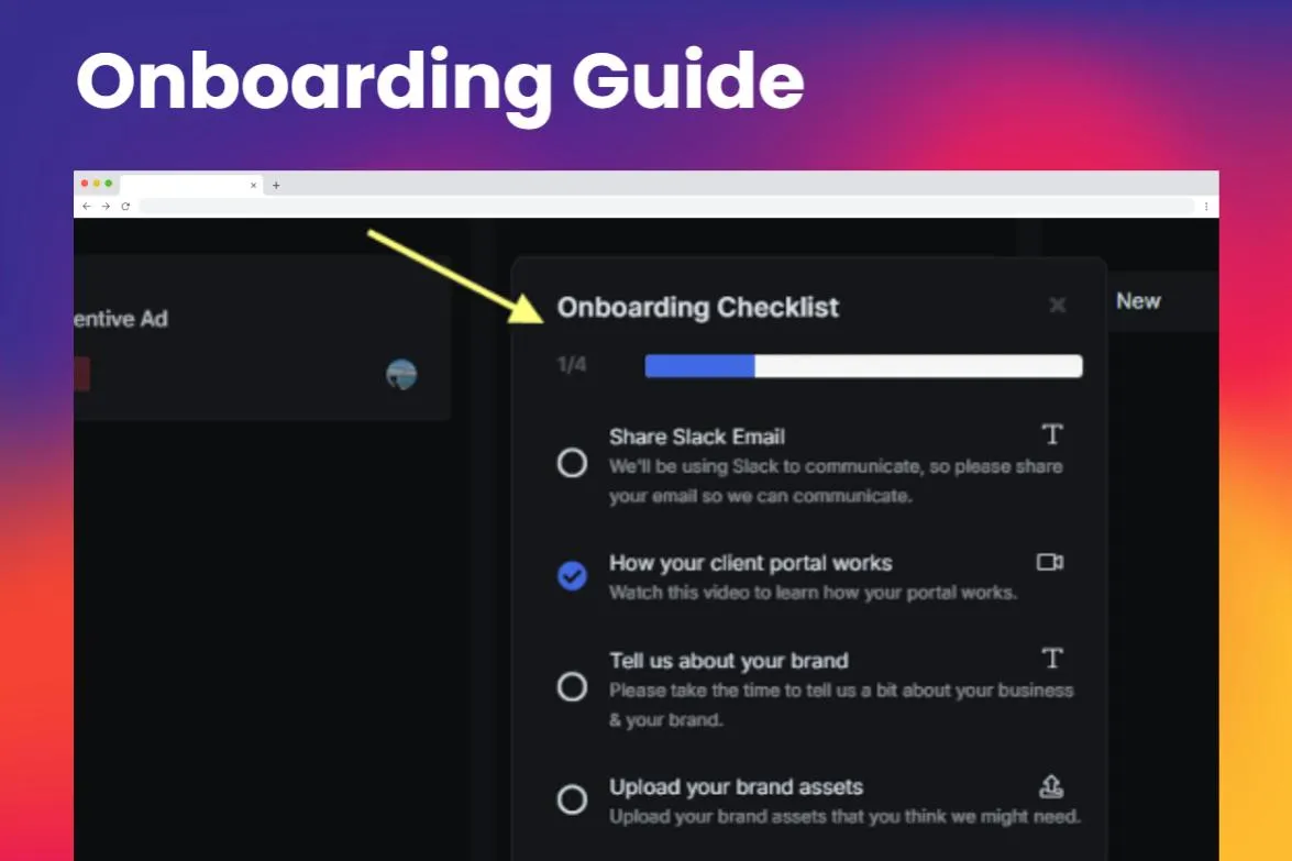 Step-by-step onboarding checklist to help you familiarize yourself with the client portal, next steps and where to find things in your user dashboard.