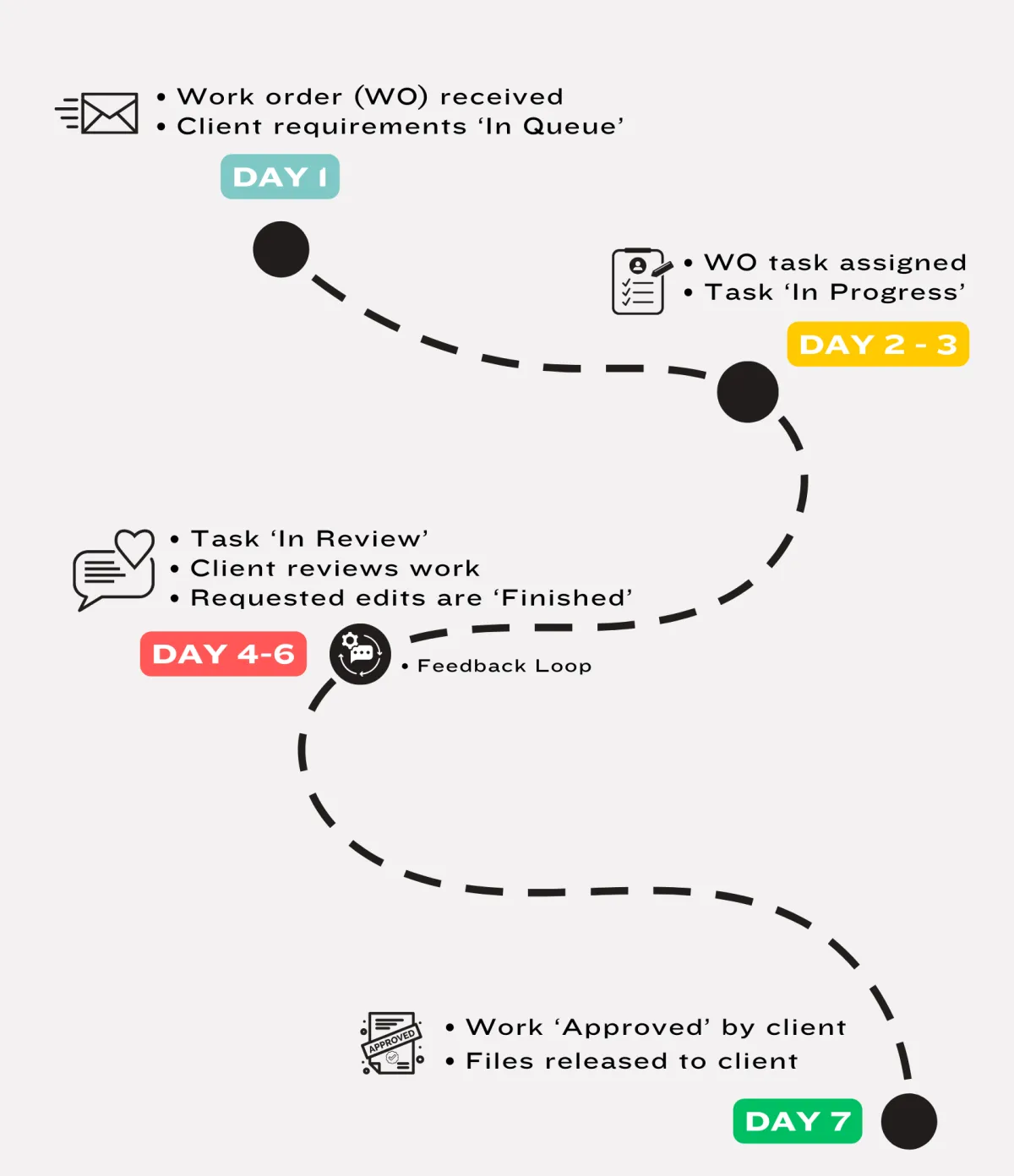 We delivery work within 7 days of receiving your word order and your brand elements whenever necessary. However, each service has a different turn-around time from 24 hours to 7 days. Please refer to the DM Marketplace to see the average turn-around time for each service or contact your assigned AE.
